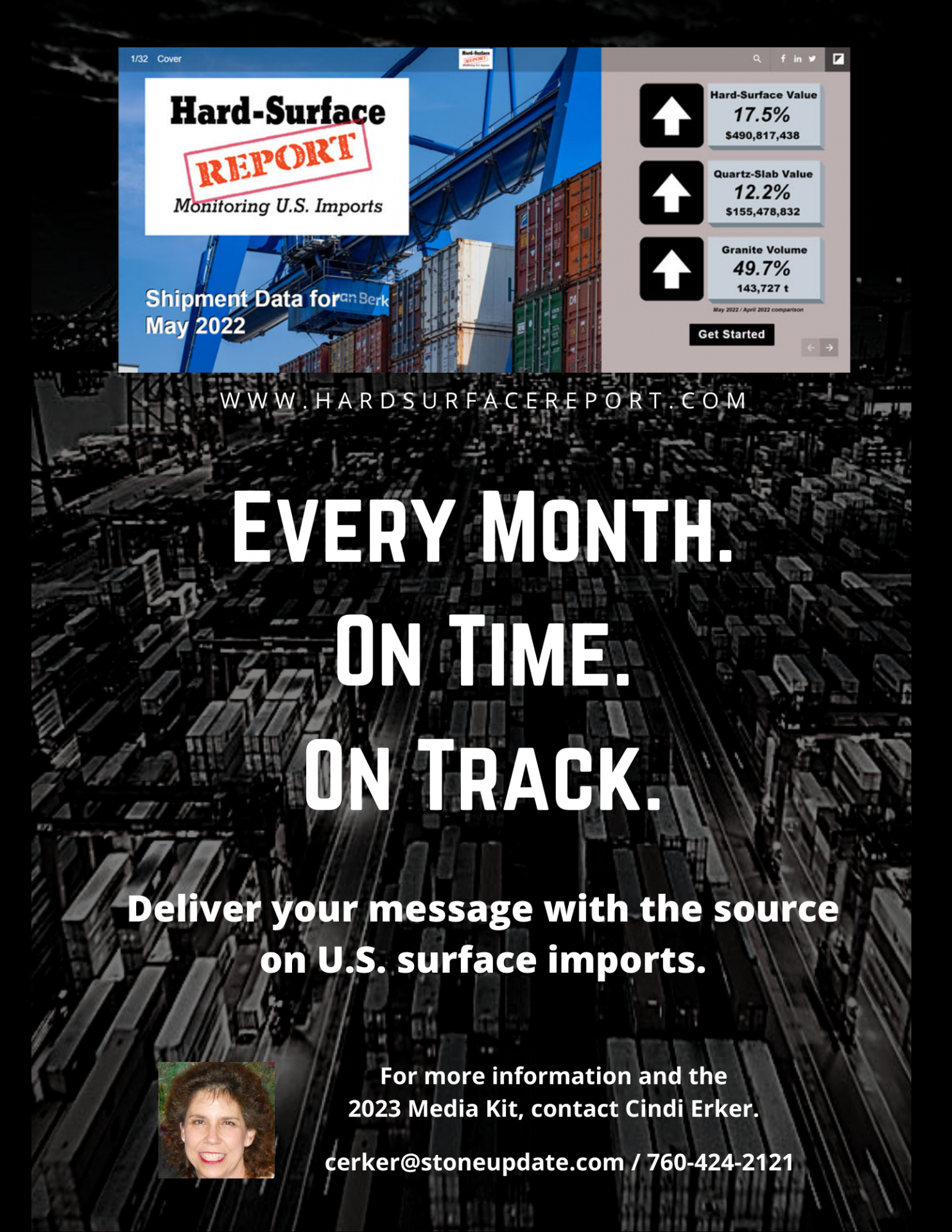 The Expected: Quartz surfaces continued the disturbing trend of underperforming inflation rates; the $120.3 million in imports during May represented only a 3% increase from April. Quartz-surfaces volume only moved up 3.9% month-over-month. It’s still a calamity zone in comparison to May 2022 shipments, with significant deficits in value (-22%) and volume (-23.6%).
